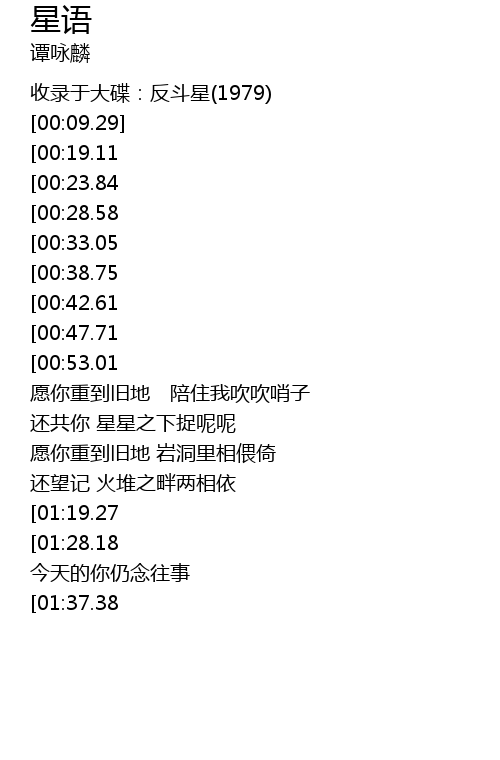 | [02:31.26][01:19.27] | 紧记对流星那次誓言 承诺盼可永藏心里 |