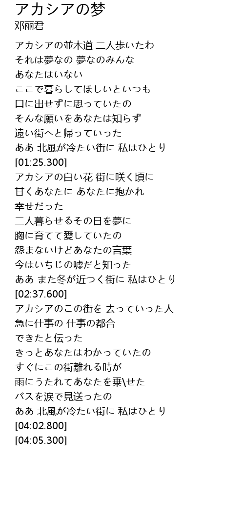 | [01:37.580] | アカシアの白い花 街に咲く頃に |