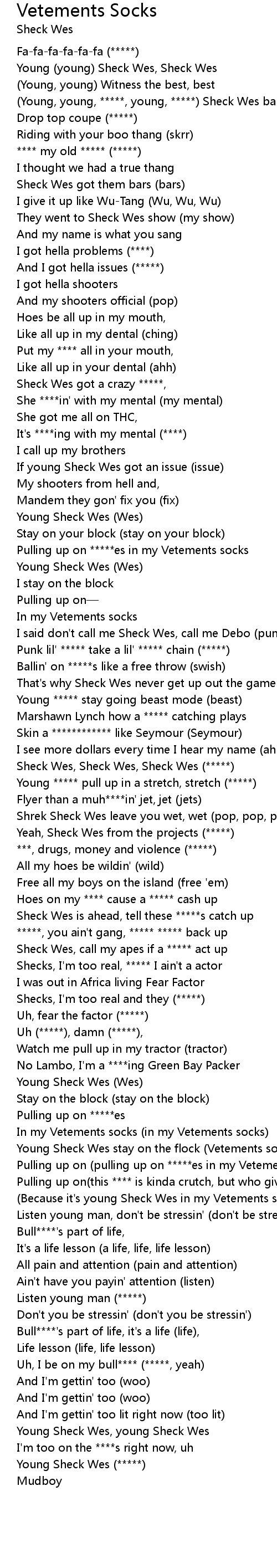 | [02:44.08] | Pulling up on (pulling up on *****es in my Vetements socks) |