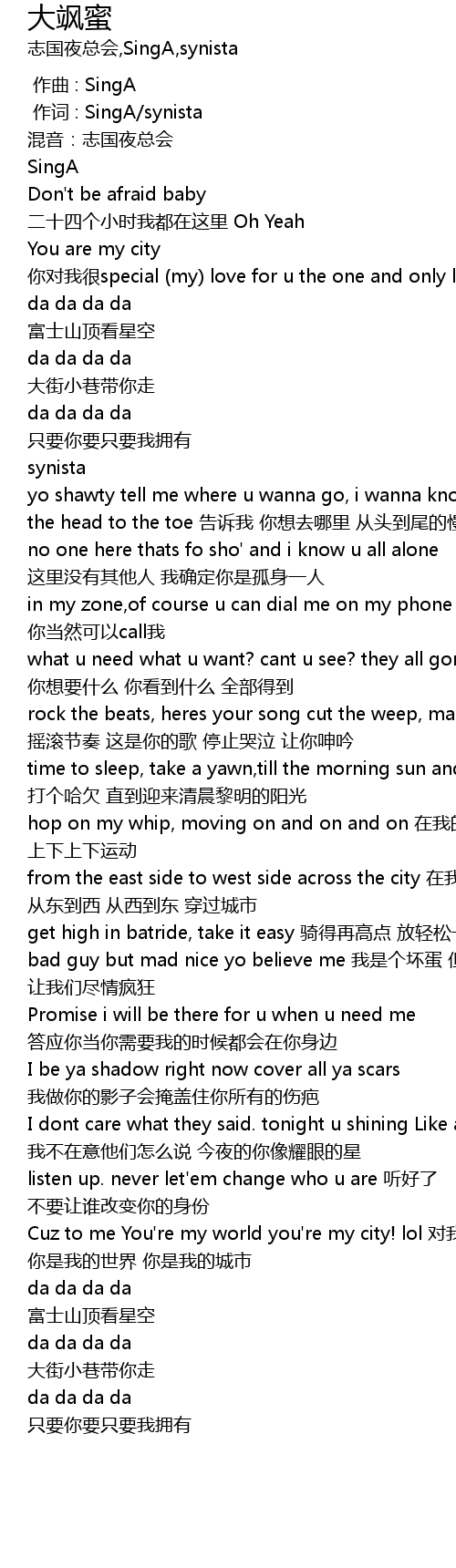 | [01:51.490] | Cuz to me You' re my world you' re my city! lol duì wǒ ér yán nǐ shì wǒ de shì jiè nǐ shì wǒ de chéng shì |