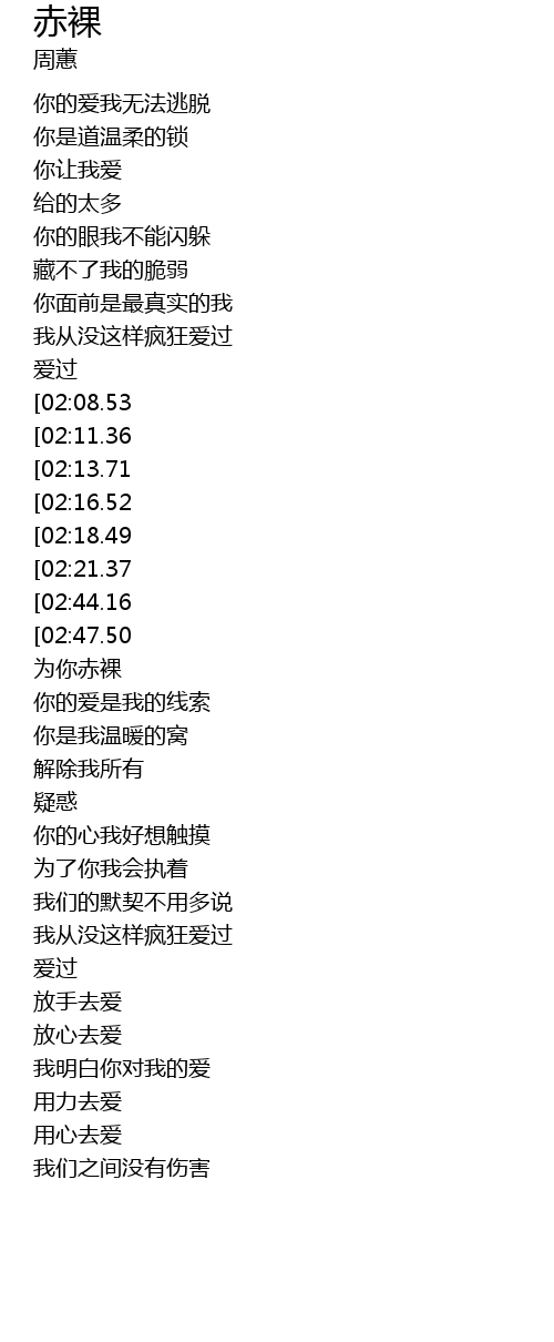 | [03:06.56][02:47.50][02:27.16][01:45.59][00:56.61] | 心只为你赤裸 |