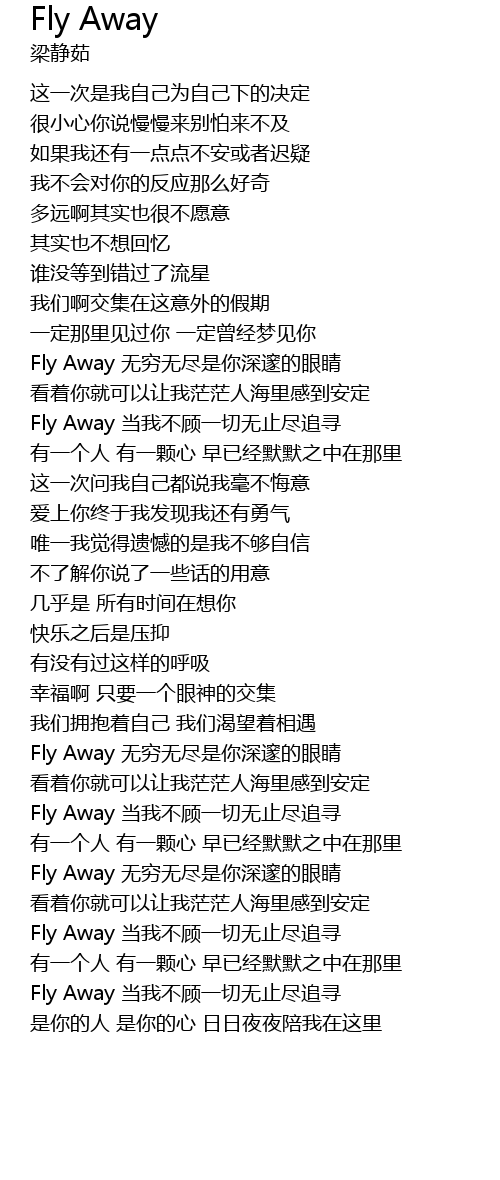 | [01:21.559] | Fly Away dāng wǒ bù gù yī qiè wú zhǐ jǐn zhuī xún |