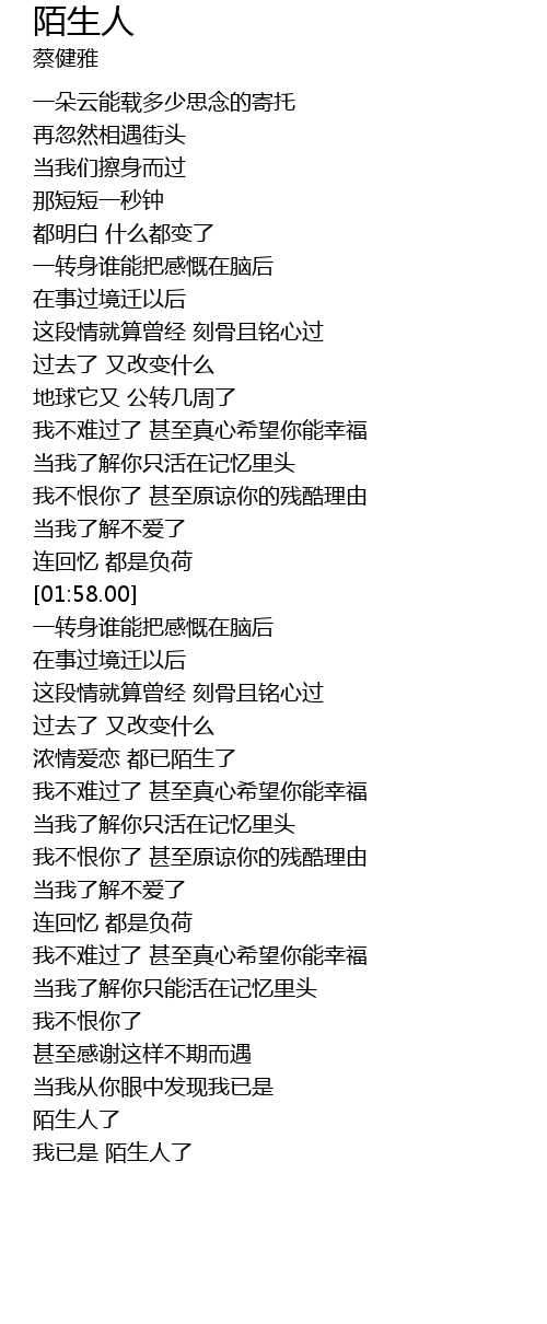 | [03:35.80] | wǒ yǐ shì mò shēng rén le |