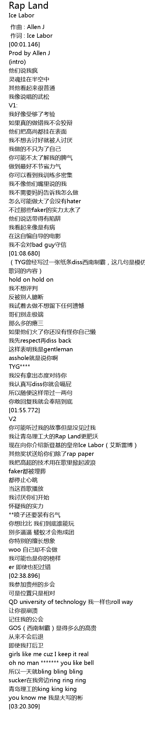 | [02:00.852] | wǒ ràng qīng dǎo lǐ gōng dà de Rap Land gèng féi wò |