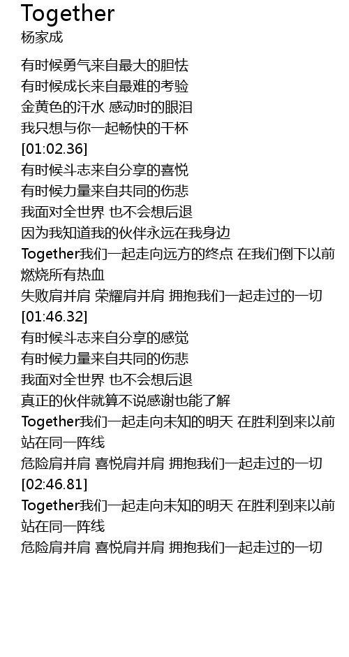 | [02:49.31] | Together我们一起走向未知的明天 在胜利到来以前 站在同一阵线 |