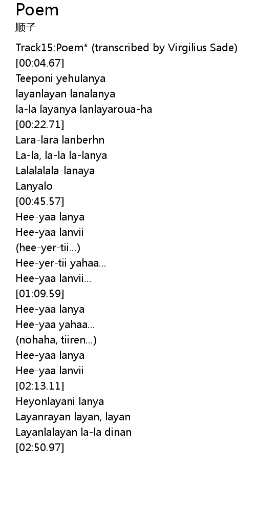 | [00:01.35] | Track15:Poem* (transcribed by Virgilius Sade) |