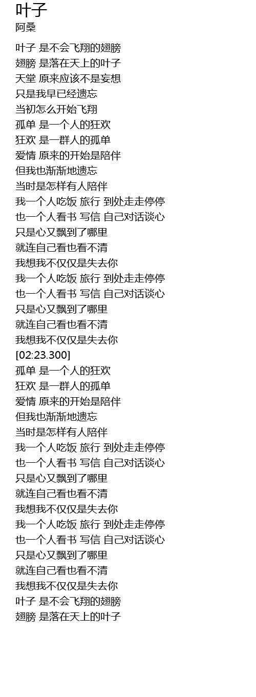 | [00:15.530] | 翅膀 是落在天上的叶子 |