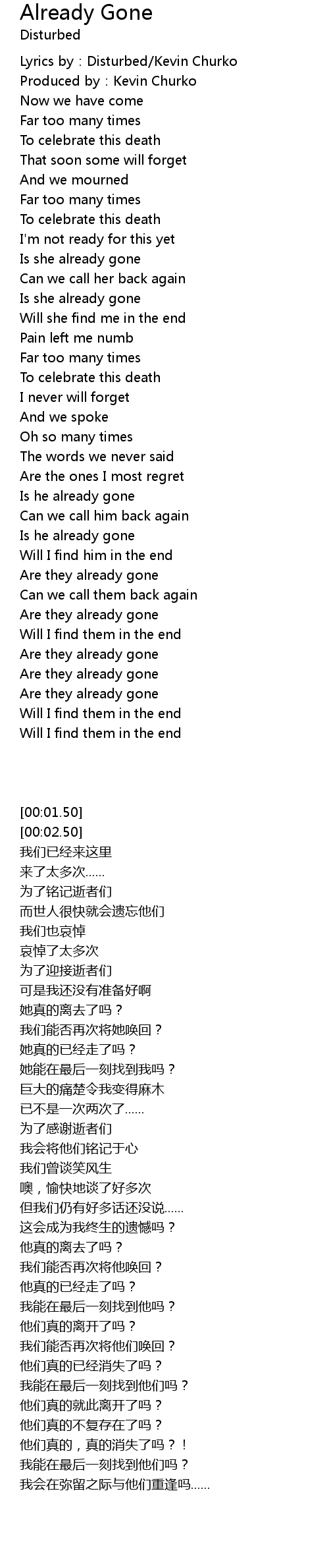| [02:22.70] | Is he already gone |