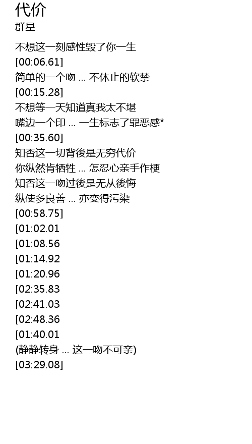 | [03:08.38][02:41.03][01:27.68] | 简单的一个吻 ... 不休止的软禁 |