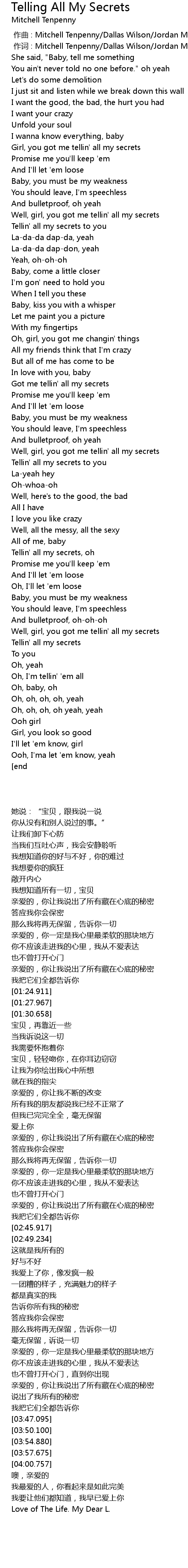 | [00:49.828] | 亲爱的,你让我说出了所有藏在心底的秘密 |