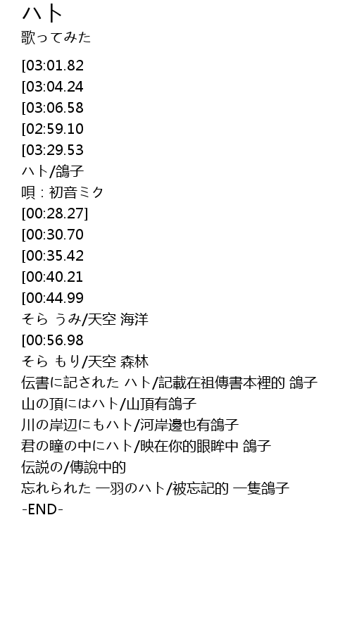 | [02:18.65][00:30.70] | ハトがくる ハトがくる/鴿子來囉 鴿子來囉 |