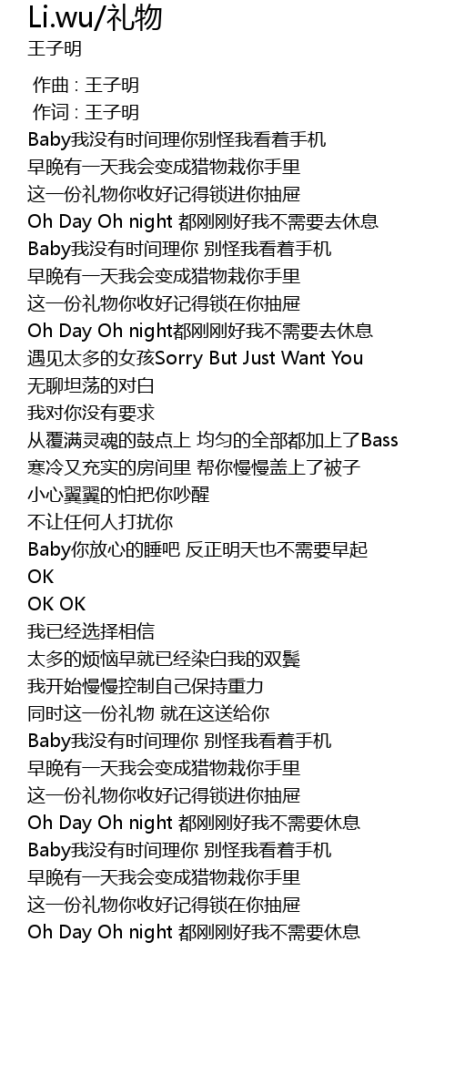 | [01:58.490] | Oh Day Oh night dou gang gang hao wo bu xu yao xiu xi |