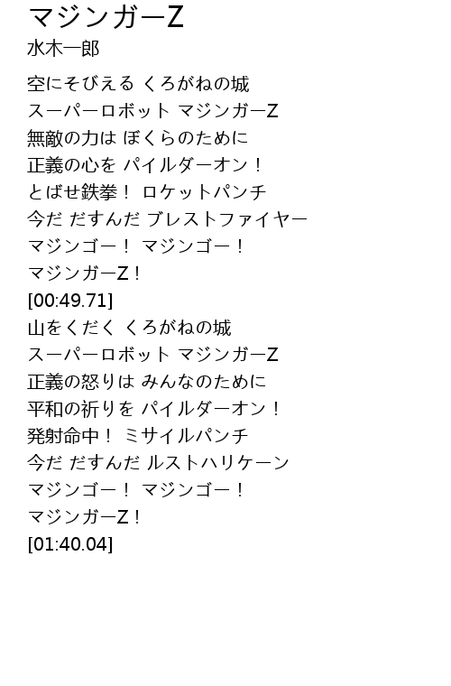 | [01:33.19] | マジンゴー! マジンゴー! |
