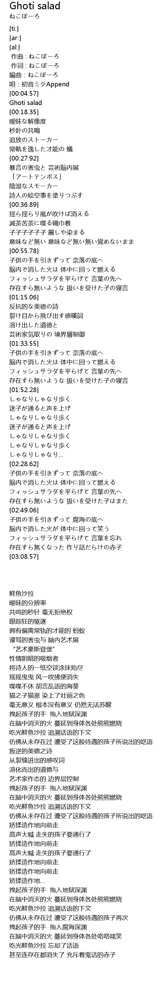 | [02:58.32] | 吃光鲜鱼沙拉 忘却了话语 |