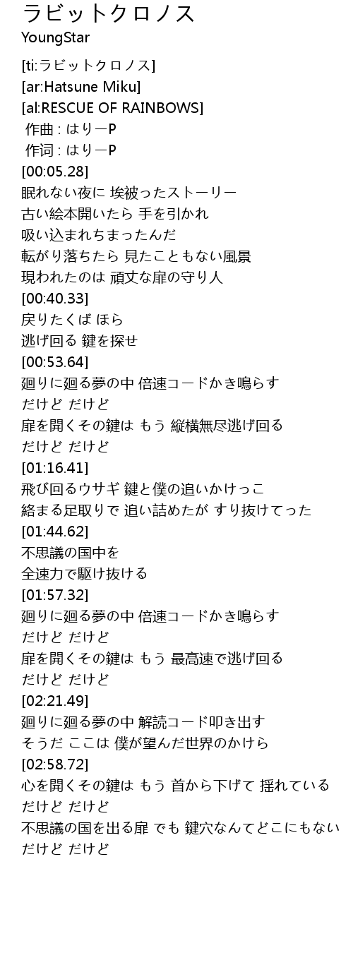 | [01:26.13] | 飛び回るウサギ 鍵と僕の追いかけっこ |