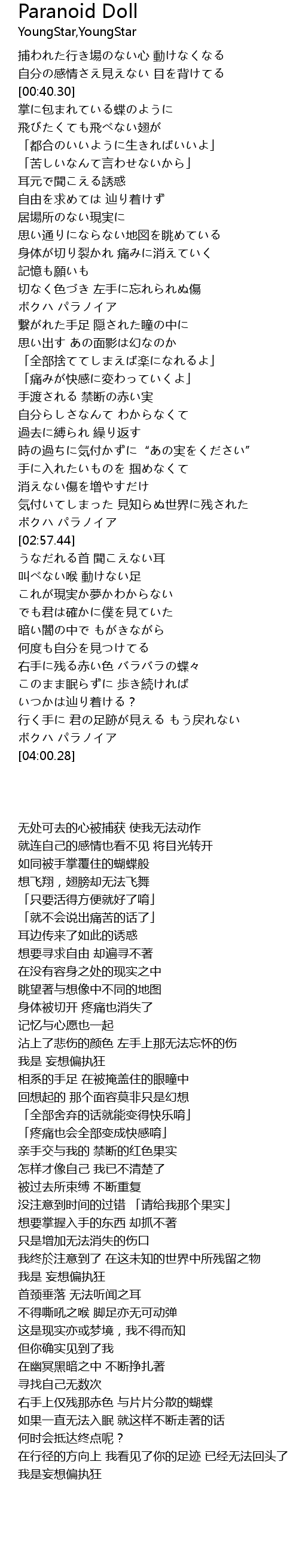 | [03:36.34] | 右手に残る赤い色 バラバラの蝶々 |