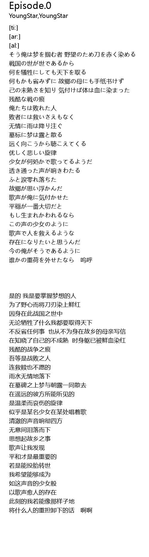 | [01:00.03] | そう俺は梦を掴む者 野望のため刀を赤く染める |