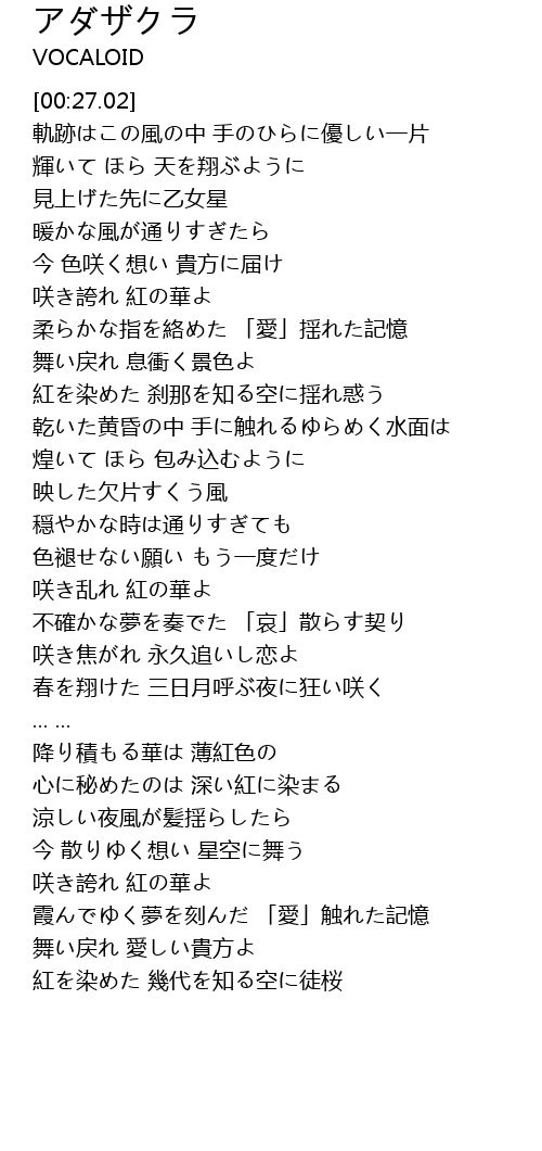 | [02:39.02] | 春を翔けた 三日月呼ぶ夜に狂い咲く |