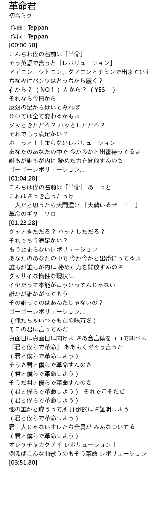 | [00:00.65] | こんちわ僕の名前は「革命」 そう英語で言うと「レボリューション」 |