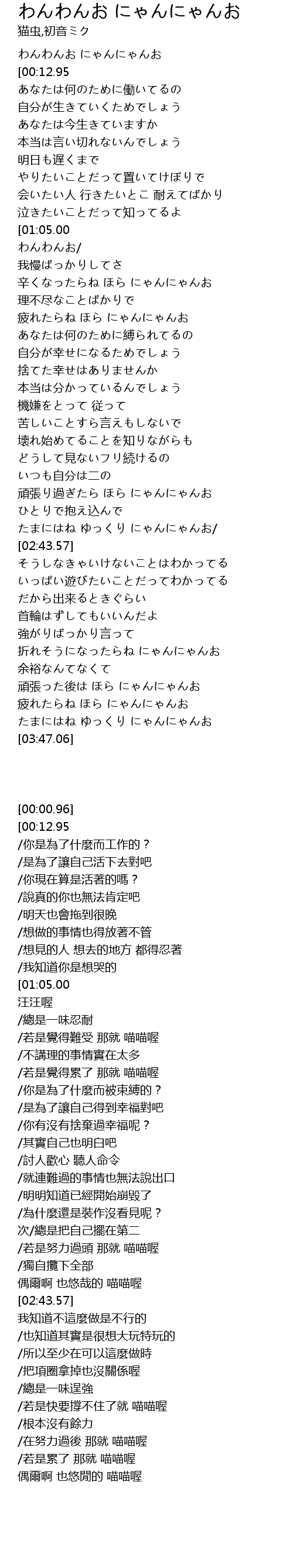 | [00:59.41][01:05.00][01:10.75][01:16.41][02:19.29][02:25.00][02:30.69][02:36.43][03:16.42][03:22.15][03:27.96][03:33.57] | わんわんお わんわんお/ |