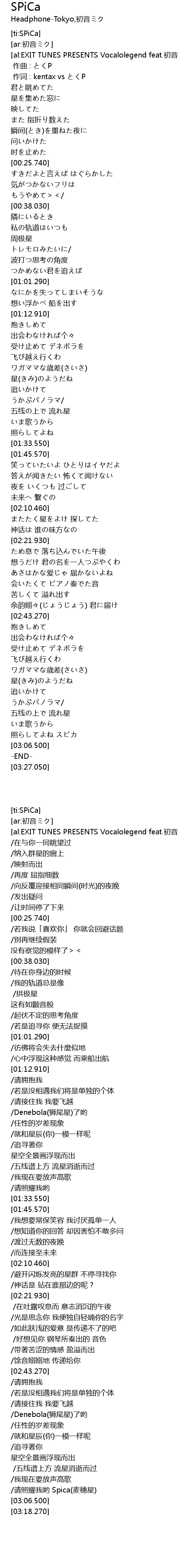 | [03:03.100] | /请照耀我哟 Spica(麦穗星) |