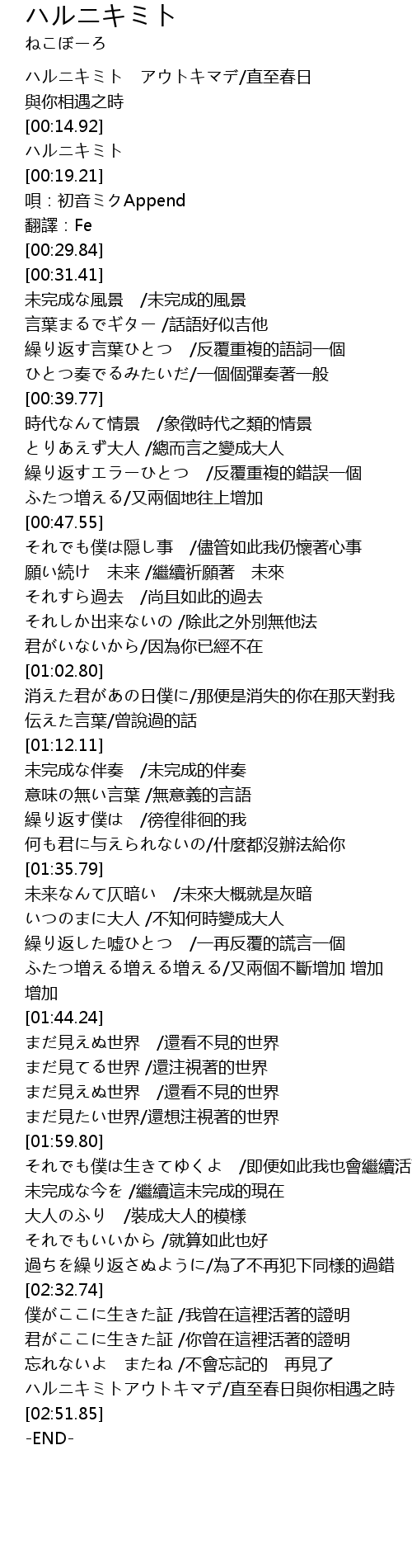 | [02:44.63] | ハルニキミトアウトキマデ/直至春日與你相遇之時 |