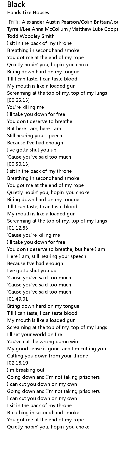 | [00:00.000] | 作曲 : Alexander Austin Pearson/Colin Brittain/Joel Alexander Tyrrell/Lee Anna McCollum /Matthew Luke Cooper/Matthew Zygmunt Parkitny/Trenton Todd Woodley Smith |