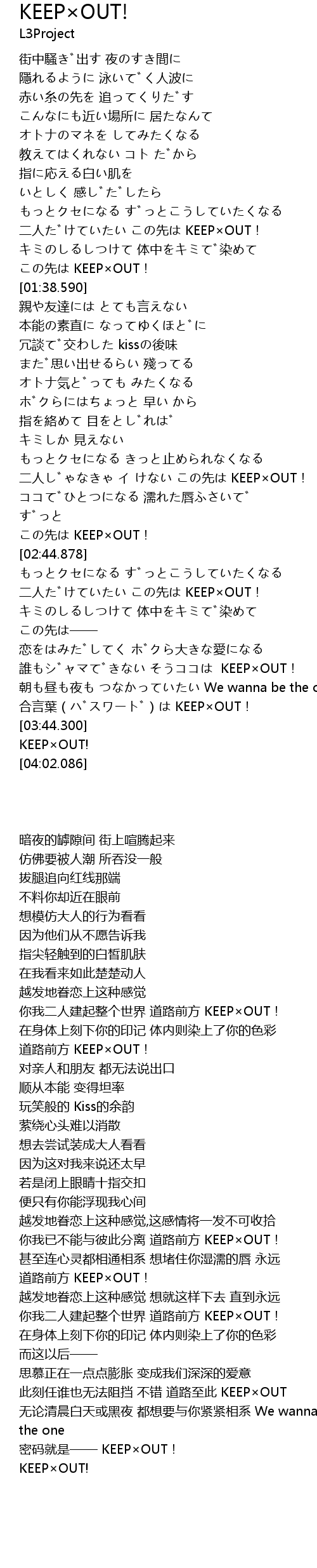 | [02:30.377] | 二人じゃなきゃ イ けない この先は KEEP×OUT! |