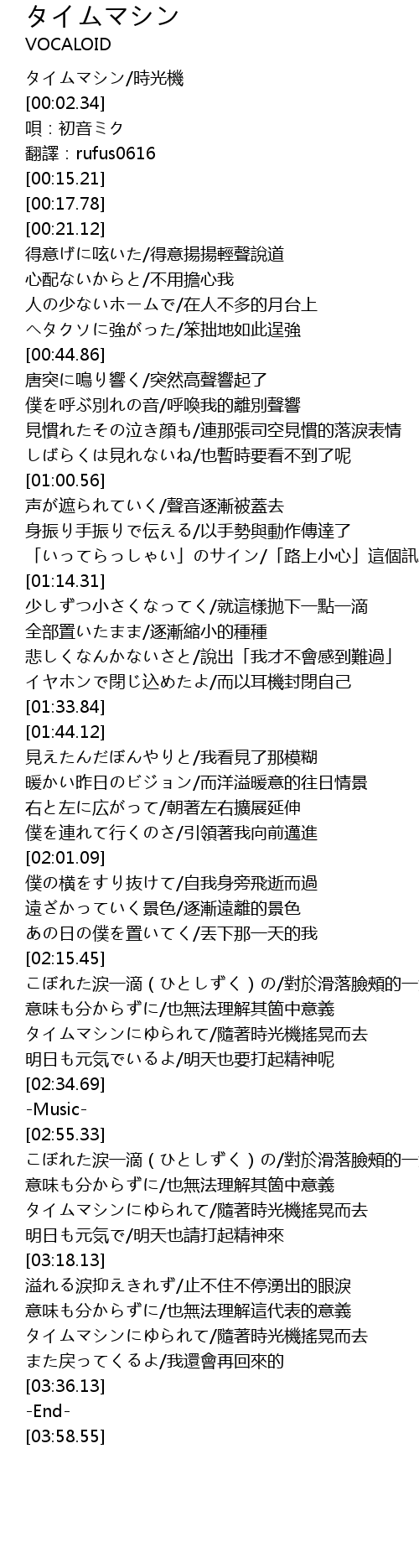| [03:26.16] | タイムマシンにゆられて/隨著時光機搖晃而去 |