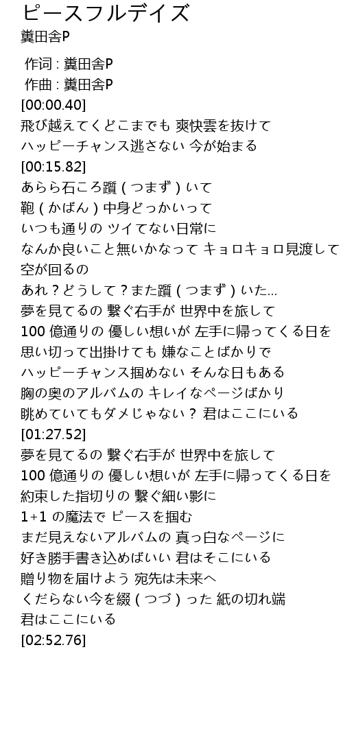 | [02:21.56] | 1+1 の魔法で ピースを掴む |
