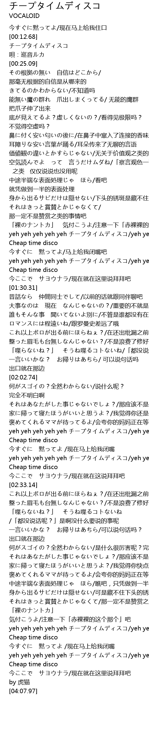 | [03:49.75] | yeh yeh yeh yeh yeh チープタイムディスコ/yeh yeh yeh yeh Cheap time disco |