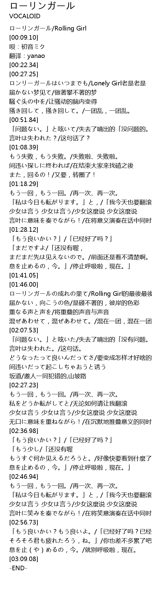 | [01:48.47] | ローリンガールの成れの果て/Rolling Girl的最後最後 |
