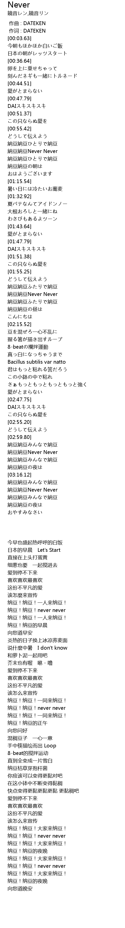 | [02:03.64] | 纳豆!纳豆!never never |