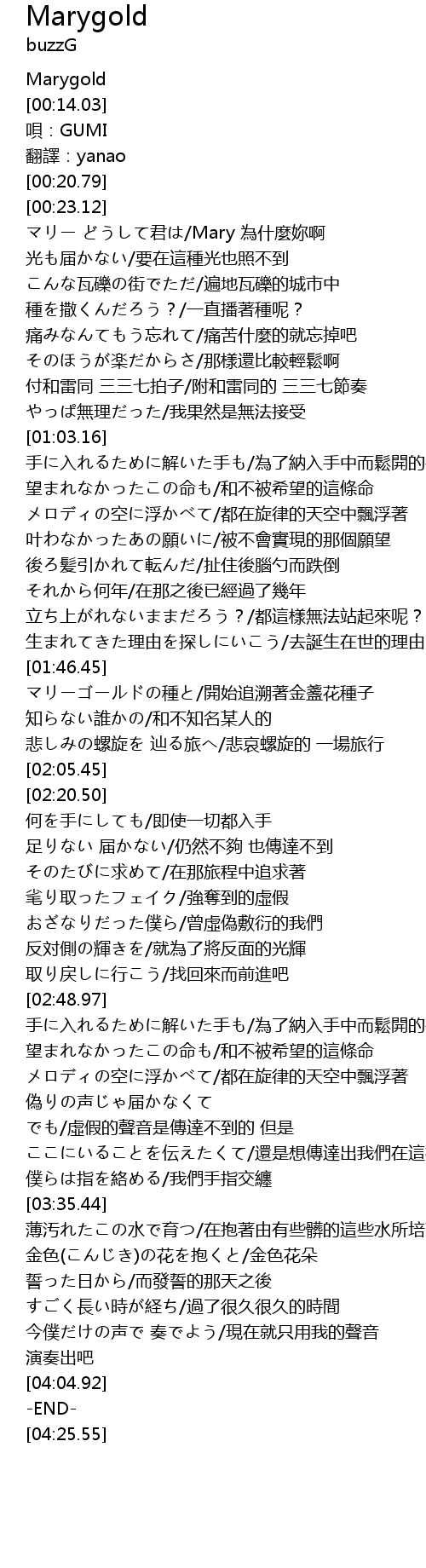 | [01:46.99] | マリーゴールドの種と/開始追溯著金盞花種子 |