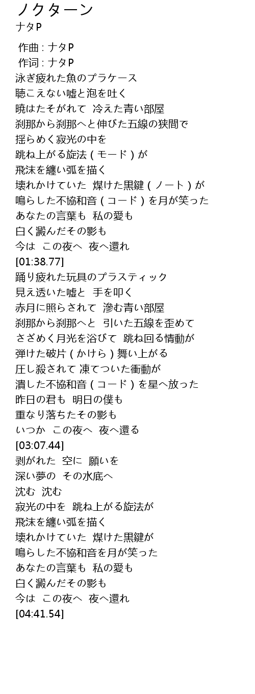 | [01:11.74] | 壊れかけていた 煤けた黒鍵(ノート)が |