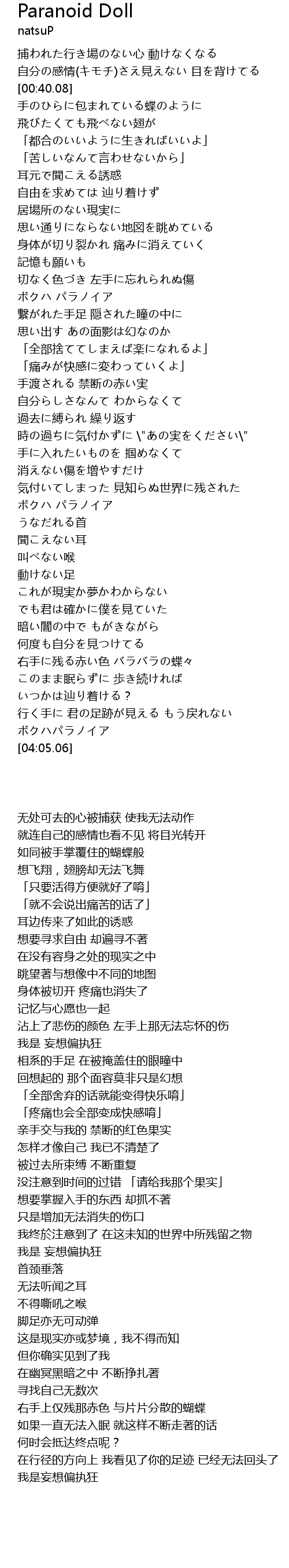 | [03:36.92] | 右手に残る赤い色 バラバラの蝶々 |