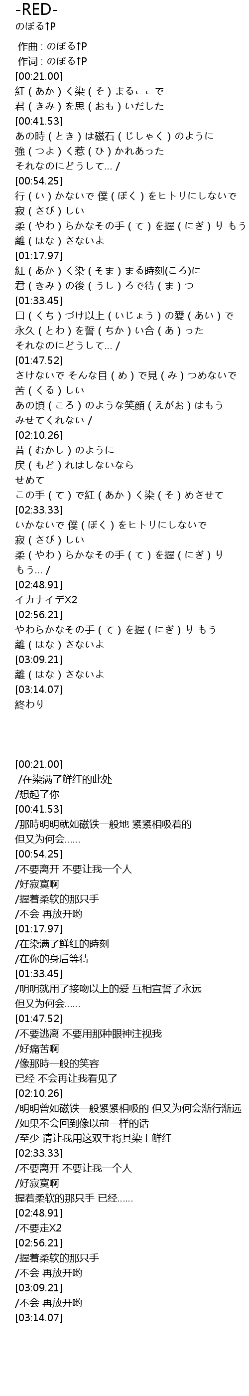 | [00:29.97] | 紅(あか)く染(そ)まるここで |