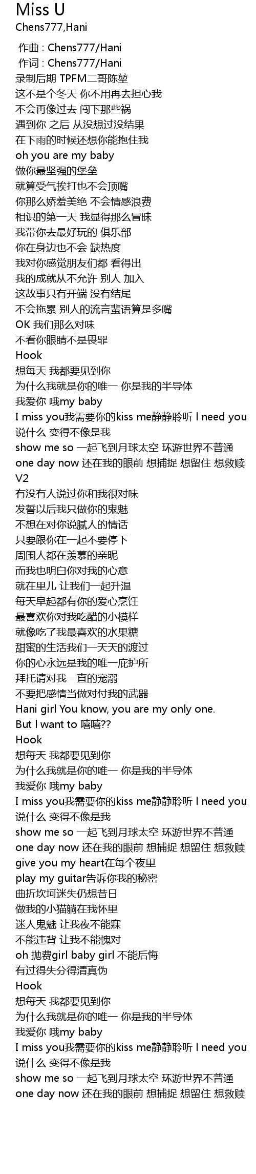 | [01:17.82] | I miss you wǒ xū yào nǐ de kiss me jìng jìng líng tīng l need you |