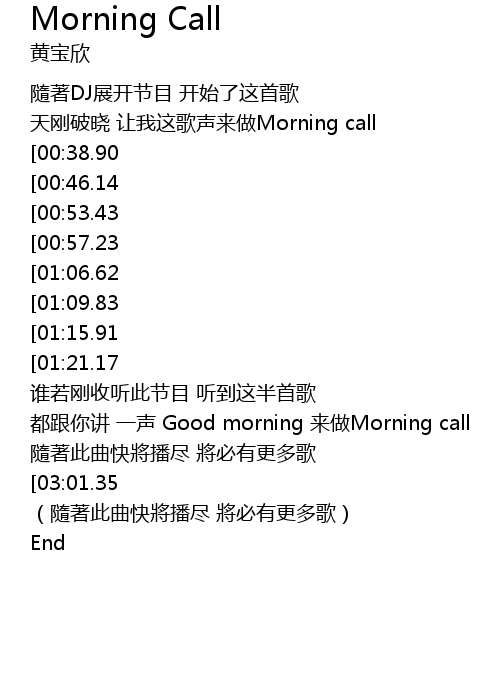 | [01:39.48] | 都跟你讲 一声 Good morning 来做Morning call |