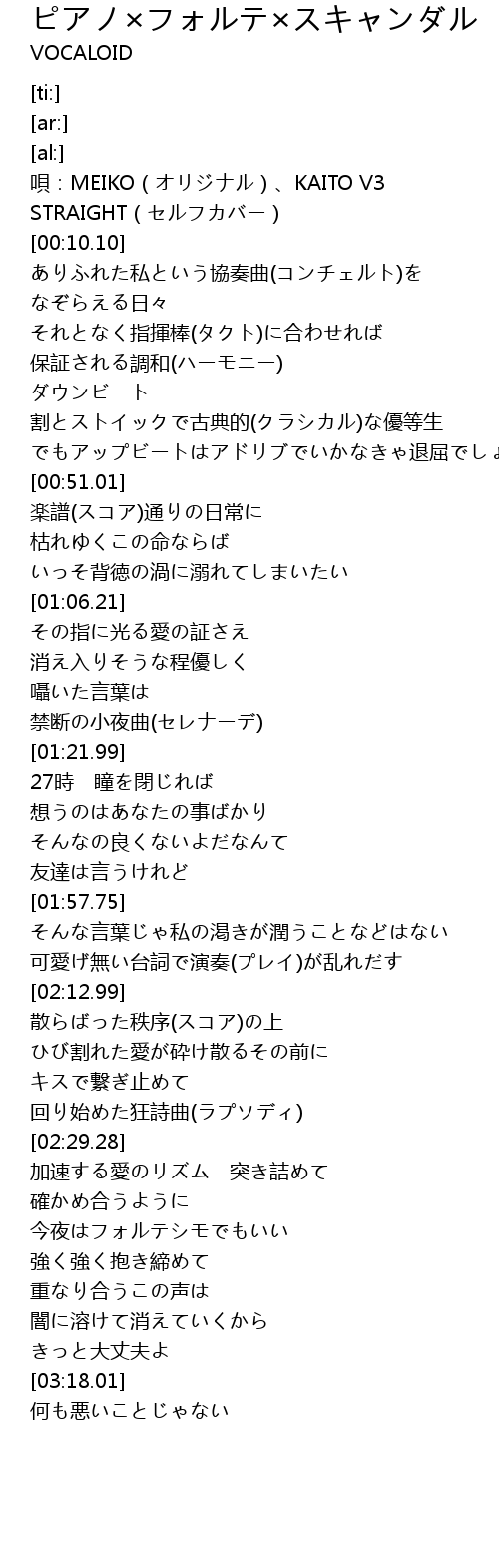 | [00:04.73] | 唄:MEIKO(オリジナル)、KAITO V3 STRAIGHT(セルフカバー) |