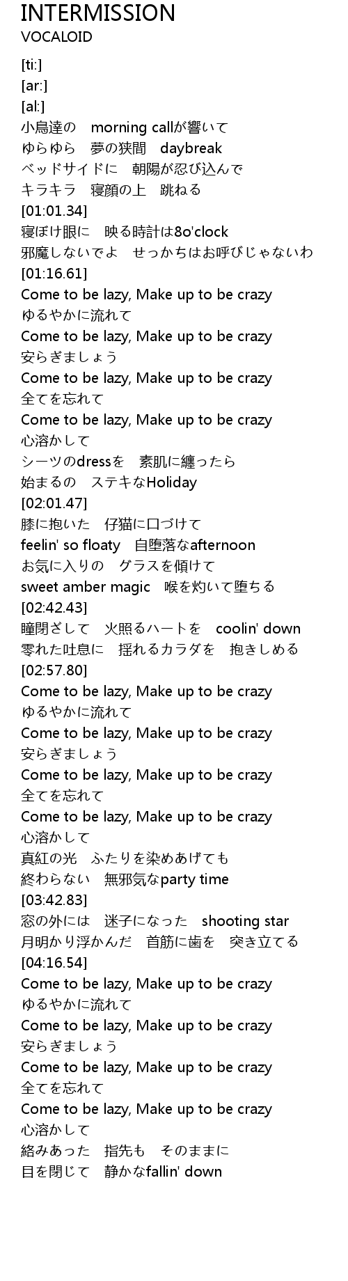 | [04:39.79] | Come to be lazy, Make up to be crazy |