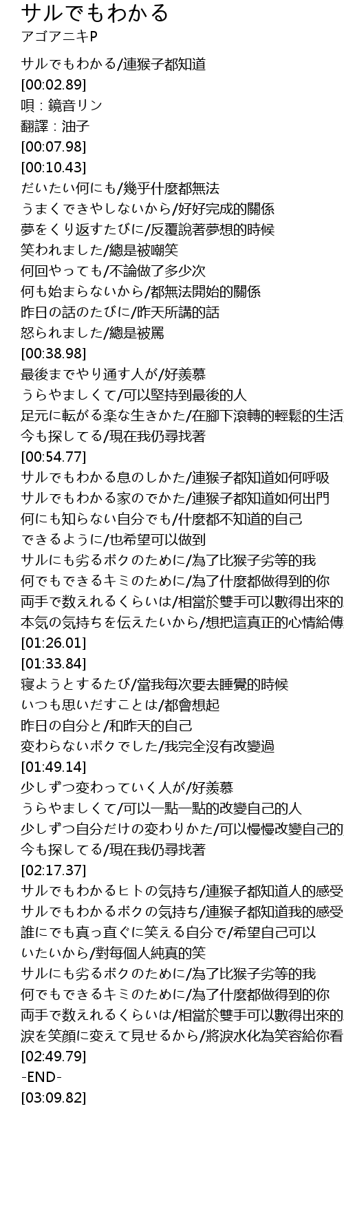 | [00:01.08] | サルでもわかる/連猴子都知道 |
