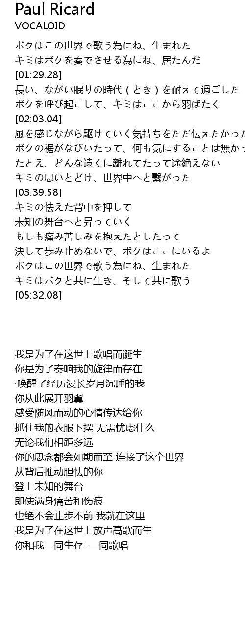| [05:04.70] | ボクはこの世界で歌う為にね、生まれた |