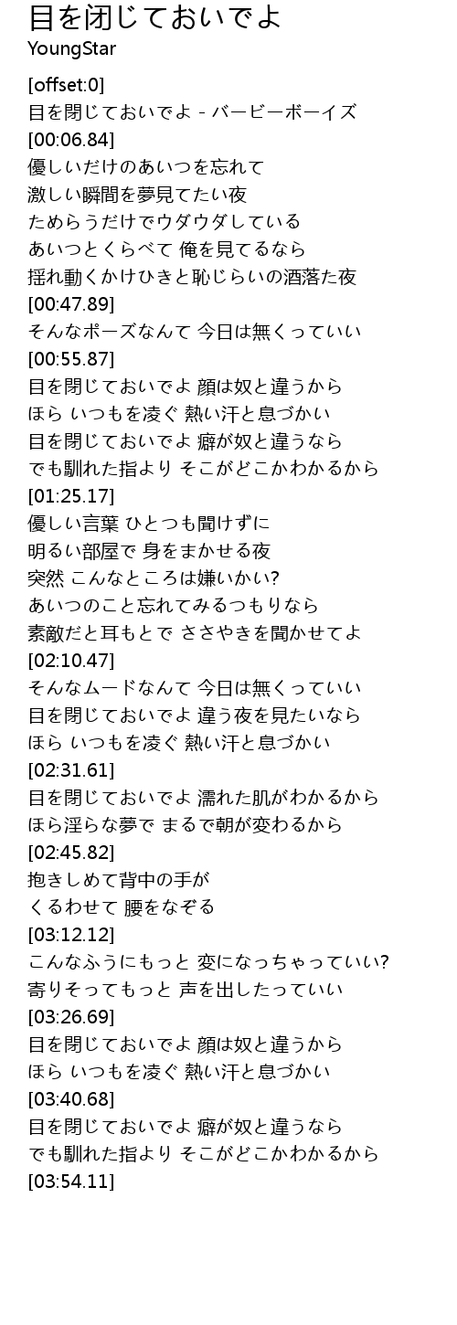 | [00:56.70] | 目を閉じておいでよ 顔は奴と違うから |