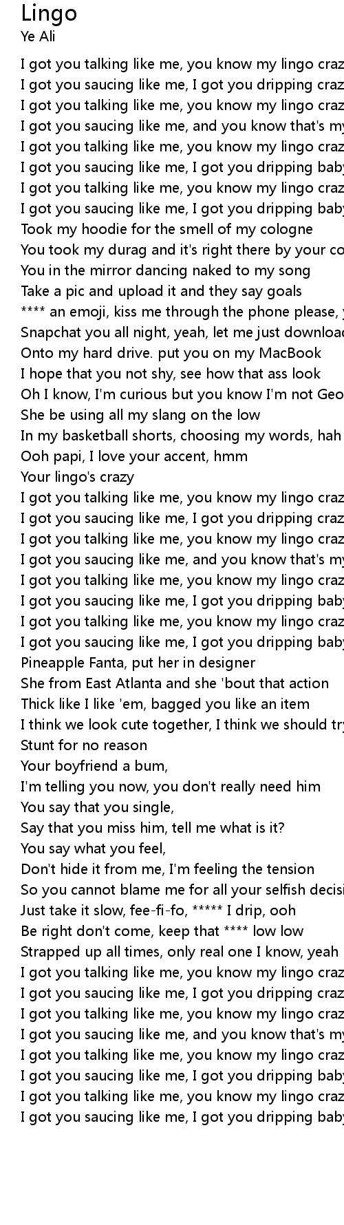 | [00:27.80] | I got you talking like me, you know my lingo crazy |