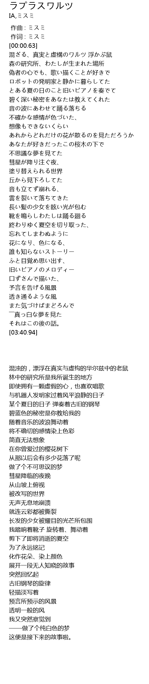 | [00:22.01] | 混ざる、真実と虚構のワルツ 浮かぶ鼠 |