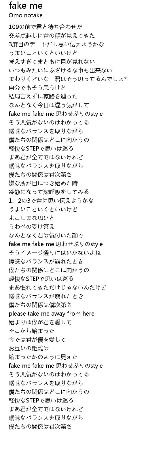 | [01:07.01] | fake me fake me 思わせぶりのstyle |