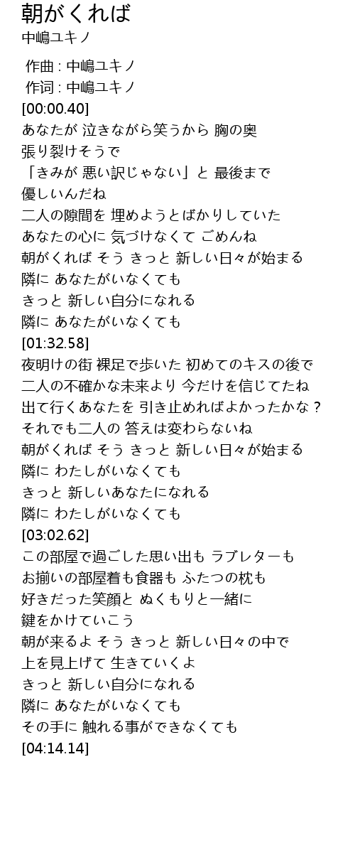 | [02:32.86] | 朝がくれば そう きっと 新しい日々が始まる |