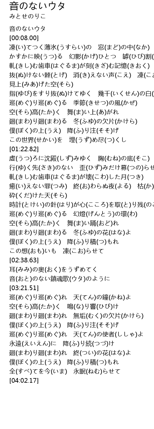| [03:18.25] | 音(おと)のない鎮魂歌(ウタ)のように |