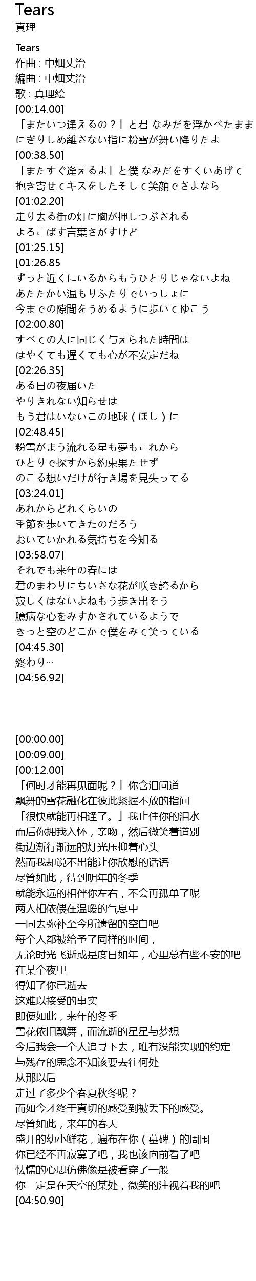 | [00:12.00] | 歌 : 真理絵 |